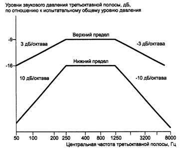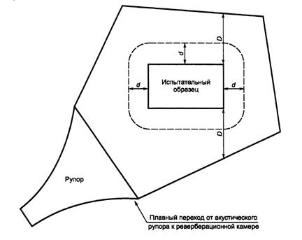Применяемые микрофоны должны быть предназначены для измерений всех случайных звуковых колебаний и давать возможность измерять пиковые значения, по крайней мере, в три раза большие, чем установленные в НД максимальные значения звукового давления р (см. 3.2.13). Чувствительность системы акустических измерений должна быть достаточной для измерения уровней звукового давления, превышающих не менее чем на 10 дБ нормированные в НД испытательные уровни. Это относится как к общему нормированному уровню, так и к уровню в отдельных частотных диапазонах. Примечание - При наличии технического обоснования могут быть нормированы дополнительные испытания и необходимость измерений в частотном диапазоне свыше 11200 до 20000 Гц. В этом случае точность системы акустических измерений устанавливают в НД на изделия или в программе испытаний. 4.3.2 Измерения вибрационной реакции образца Наблюдение вибрации образца, при необходимости, может быть проведено путем измерений ускорения и/или деформации (при необходимости также может быть измерено смещение или скорость). Оборудование для наблюдения должно быть способно к измерению общей вибрационной реакции образца в диапазоне частот не менее чем 16 - 2000 Гц. Номинальный спектр реакции этих приборов должен превышать требуемый спектр воздействий в необходимом диапазоне частот и иметь возможность непрерывной записи наблюдений. Данные измерений, полученные по 4.3.1 и, при необходимости, по 4.3.2, должны быть проанализированы по частотным составляющим. При анализе акустических измерений разрешение должно составлять не менее одной октавы (предпочтительно, треть октавы). При анализе вибрационной реакции обычно используют более высокое разрешение; для этого используют фильтры с постоянной абсолютной (например, 10 Гц) или постоянной октавной (например, 1/12-октавные) шириной полосы пропускания. Ширина полосы пропускания фильтра должна быть установлена в НД на изделие в зависимости от условий испытаний. 4.4 Требования к испытаниям Выбор испытательного оборудования зависит от характера пространственно-временных изменений звукового поля, которые должны быть воспроизведены при помощи этого оборудования. Основным устройством, применяемым в настоящее время для создания испытательного пространства, является реверберационная камера, требования к испытаниям в которой приведены в 4.4.2 - 4.4.4. В приложении А приведены также другие типы устройств, пригодные для испытаний по требованиям настоящего стандарта. Требования к типу оборудования должны быть приведены в НД на образец. При необходимости проведения комбинированных испытаний, при которых образец подвергают одновременному воздействию высокоинтенсивного акустического шума и другому виду внешних воздействий, испытания на воздействие акустического шума проводят в соответствии с настоящим стандартом. Образец размещают в центре реверберационной камеры таким образом, чтобы по возможности основные поверхности образца не были параллельны стенам, полу и потолку. Резонансная частота закрепленного образца должна быть менее 25 Гц или менее четверти низшей частоты требуемого диапазона частот (принимают наименьшее из этих двух значений). В НД на образец при необходимости должны быть указаны предпочтительные точки крепления или присоединения. Расстояние между управляю