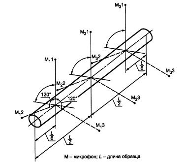 На рисунках А.1 - А.3 приведены типичные примеры расположения точек на воображаемой поверхности вокруг образца, микрофонов вокруг тонкого цилиндрического образца и микрофонов вокруг образца соответственно. Во всех случаях расположение микрофонов должно удовлетворять требованиям испытаний.