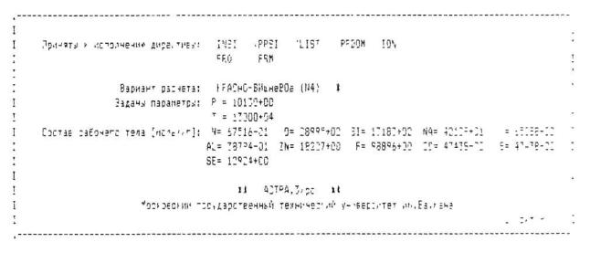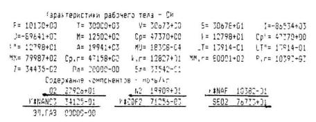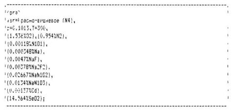 Условная химическая формула воздуха – N5,464O1,469. Этот материальный баланс закладывается как исходные данные в программу расчета на ЭВМ равновесного состава. В исходные данные входят также давление и температура в печи. Нормальному атмосферному давлению 760 мм рт.ст. соответствует 0,1013 МПа. Температура в печи в Кельвинах должна быть известна из технологического процесса. Из распечатки результатов (см. Приложение) выписывается массовая доля конденсированных компонентов рабочего тела (параметр Z на распечатке) и равновесный состав газовой фазы печного пространства Mi; в молях на килограмм рабочего тела. Газообразные компоненты отличаются от конденсированных тем, что у последних химическая формула начинается с символов K* . Выписывать необходимо только те газообразные компоненты, содержание которых достаточно велико, например Mi > 0,1×10-4. Указанные данные записываются в первый и второй столбцы таблицы 2, форма которой приведена ниже. Удельные выделения и выбросы вредных веществ