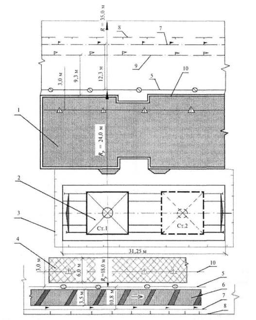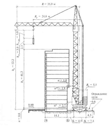 Рисунок 1 - Привязка башенного крана к зданию Расстояние от оси крана до стены здания S = Б+0,5K = 4,5 + 0,5 · 7,5 = 8,25 м. При подъеме груз перемешается на высоте не менее чем на 500 мм выше встречающихся препятствий. 3.1.5. Высота подъема крюка hп определена: hп = (hз + п) + hгр + hгр.пр + 2,3 = (41,3 + 0,6) + 3,0 + 5,0 + 2,3 = 52,2 м, где hз = 41,3 м- высота здания; п = 0,6 м - разность отметок головки рельса и нулевой отметки здания; hгр = 3 м - высота поднимаемого груза; hгр.пр = 5 м - длина грузозахватного приспособления; 2,3 - нормативный запас высоты из условий безопасного производства работ на верхней отметке здания, м. 3.1.6. Зона работы крана определена по значениям параметров (перемещения, вылета и высоты подъема крюка, поворота стрелы), при которых обеспечиваются монтажные работы при возведении здания и погрузочно-разгрузочные работы. Зоны ограничения высоты подъема крюковой подвески 52,2 м и 6 м и ограничения вылета 24 м и 18 м установлены по максимальным значениям высоты и вылета для соответствующих зон. Зона предупреждения устанавливается согласно нормам с учетом скорости и массы перемещаемого груза на расстоянии 3 м перед зоной запрета. 3.1.7. На рисунке 2 приведен фрагмент стройгенплана с зонами, образующимися при работе башенного крана. Здание 1 возводится с применением башенного крана 2, перемещающегося на крановом пути длиной 31,25 м. Зона работы крана при максимальном вылете R = 35 м проходит над временной автомобильной дорогой по постоянной трассе 6, выходит за линию ограждения строительной площадки 8, поэтому на кране устанавливаются приборы СОЗР. Система ограничивает вылет с R = 35 м до Rp = 24 м и Rp =18 м по линиям 5 ограничения зоны действия крана. Знаки 10 предупреждения об ограничении зоны действия крана устанавливаются на расстоянии 3 м перед линиями ограничения 5 зоны действия крана. Опасные зоны определены по установленной и общепринятой методике. Опасная зона 9 от возможного падения предмета с наибольшим габаритом 3,7 м с высоты возводимого здания находится на расстоянии 9,3 м от стены. Опасная зона от возможного падения груза (плита перекрытия с размером 6,6×3,7 м), перемещаемого краном над площадкой 4 на высоте, ограниченной 6 м, принята 10,8 м. Опасная зона от возможного падения груза, перемещаемого краном с применением страховочных приспособлений, составляет 12,3 м. Опасные зоны от возможного падения груза обозначены линиями 7 (см. рисунок 2). Рисунок 2 - Стройгенплан с зонами, образующимися при работе башенного крана (фрагмент) 3.1.8. Ограждение кранового пути 3 высотой 1,2 м, конструкция которого приведена в проекте пути, устанавливается на расстоянии 4,5 м от оси головки рельса и торцов рельсовых нитей. В торцах пути ограждение примыкает к зданию. Согласно проекту рельсового пути устанавливают следующие знаки безопасности, изготовленные в соответствии с требованиями ГОСТ Р 12.4.026: «Вход на крановый путь запрещен»; «Место стоянки крана». 3.1.9. Крайние стоянки крана, обозначенные на рисунке 3 Ст.1 и Ст.2, расположены на расстоянии 1,5 м от тупиковых упоров. Место стоянки крана в нерабочем положении совмещается с крайней стоянкой Ст. 1. 3.1.10. Подготовка к работе Системы ограничения зоны работы крана включает следующие основные работы: - составление плана работы и запрет движений крана; - установку Системы (датчиков, микропроцессорного устройства, электрошкафа) согласно схеме рисунка 3; - электротехническ
