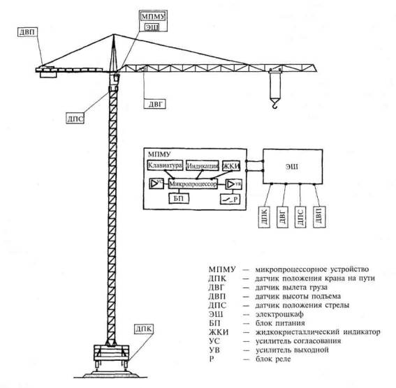 Рисунок 3 - Установка на кране Системы ограничения зоны работы крана При вхождении в зону запрета груза (крюковой подвески) Система должна выдавать запрещающий сигнал (загорается красная лампочка) и автоматически отключать соответствующие приводы крана. 3.1.12. Программа работы Системы составляется по плану работы и запрета движений крана путем установки крюковой подвески (груза) в заданных точках на границе зоны запрета и соответствующей тарировки датчиков. 3.1.13. Для разгрузки и временного складирования сборных элементов здания предназначена площадка 4 шириной 6 м (см. рисунок 2). Длина площадки установлена с учетом размещения не менее трех автомашин, одновременно стоящих под разгрузкой, и принята 38 м. Площадки для приема раствора и бетонной смеси, складирования строительных материалов и другого назначения (для хранения съемных грузозахватных приспособлений, для нахождения контрольного груза, для стенда со схемами строповки и таблицами масс грузов, санитарно-бытовых помещений и т.п.) и другие обязательные составляющие строй генплана здесь условно не показаны. 3.1.14 Ширина временной автомобильной дороги по постоянной трассе 6 при сквозном однополостном движении в направлении, указанном стрелкой, принята 3,5 м (см. рисунок 2). Шкаф электропитания башенного крана, закрывающийся на замок, установлен с наружной стороны ограждения кранового пути. К шкафу электропитания предусмотрен свободный подход. Административно-бытовые помещения и другие временные здания и сооружения, где находятся люди, размещены за пределами опасных зон. 3.1.17. Схемы строповки разработаны на сборные элементы здания (наружные и внутренние панели и перегородки, плиты перекрытий и покрытий, блоки инженерных коммуникаций, детали шахты лифтов и т.д.) и на непроизводственные грузы (поэтажная прорабская, будка герметчика, контейнеры с монтажной оснасткой и т.д.). Схемы строповки разработаны по рабочим чертежам сборных элементов с учетом их конструкции, габаритов и масс, расположения монтажных петель. Схемы строповки пронумерованы в проекте производства монтажных работ. Таблица масс грузов составлена по спецификациям сборных элементов здания и по расчету для других строительных грузов. Место расположения на строительной площадке стенда со схемами строповки и с таблицей масс грузов указывается на стройгенплане. 3.1.18. Основные и дополнительные знаки безопасности, показанные на стройгенплане, должны быть установлены на местности по правилам РД 11-06. 3.1.19. Техническое освидетельствование съемных грузозахватных приспособлений и тары производится до ввода их в эксплуатацию и в процессе эксплуатации согласно ПБ 10-382 и МДС 12-31. 3.1.20. Готовность к эксплуатации крана, оснащенного Системой ограничения зоны работы, кранового пути и съемных грузозахватных приспособлений, подтверждается соответствующими актами сдачи-приемки. 3.2. Основные работы3.2.1. Монтаж сборных элементов здания производится преимущественно с транспортных средств и с максимальным совмещением монтажных работ с внутренними общестроительными и специальными работами, включая сборку лифтов и отделочные работы. 3.2.2. В связи с тем, что временная автомобильная дорога 6 для технологического автотранспорта попадает в опасную зону, ограниченную линией 7, необходимо выставить сигнальщиков. Сигнальщики должны н