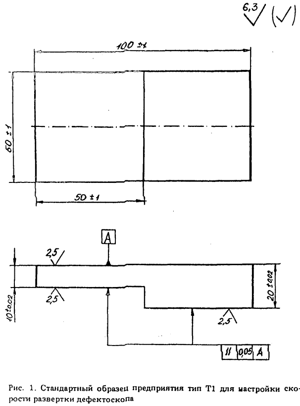 где r1 и r2 - радиусы кривизны поверхностей измерения. 1.14. Карта измерения толщины должна иметь порядковый номер и содержать: идентификационные данные объекта контроля (наименование изделия, номер чертежа, обозначение сварного шва или антикоррозионного покрытия и т.д.); схему разметки изделия для измерения толщины либо наименование и номер КД, содержащей эту схему; обозначение марки стали, а для наплавки - число слоев с указанием марки электродов и число проходов; указание о номинальной толщине объекта измерения с допускаемыми отклонениями; информацию о применяемых средствах контроля; при этом ПЭП и СОП должны быть определены однозначно; указание о погрешности измерения толщины; указания о методическом и нормативном документах, на основе которых проводятся измерение толщины и оценка годности изделия. 1.15. Отступления от данной методики должны быть согласованы с головной материаловедческой организацией и ее метрологической службой. 2. Аттестация контролеров2.1. К проведению измерения толщины по настоящему НТД допускаются контролеры, аттестованные в порядке, аналогичном изложенному в ПНАЭ Г-7-010-89 "Оборудование и трубопроводы атомных энергетических установок. Сварные соединения и наплавки. Правила контроля". 3. Средства измерения толщины3.1. Для измерения толщины следует применять следующую аппаратуру: 3.1.1. УЗ-толщиномеры с цифровой индикацией результата измерения с преобразователями, входящими в комплект прибора. 3.1.2. УЗ-дефектоскопы второй и выше групп по ГОСТ 23049-89. Дефектоскопы с БЦО применяются в диапазоне действия этого блока, а без БЦО - в диапазоне действия задержки развертки. 3.1.3. Импортные дефектоскопы и толщиномеры могут применяться для измерения толщины, если они имеют классификационные признаки, соответствующие пп. 3.1.1, 3.1.2. 3.1.4. УЗ-толщиномеры применяются для измерения толщины моно- и биметаллов. 3.1.5. УЗ-дефектоскопы применяются для измерения толщины всех объектов, предусмотренных настоящим НТД. 3.1.6. Диапазон применения толщиномеров и дефектоскопов по минимальным геометрическим размерам (толщинам стенки и наплавки, радиусу кривизны) определяется параметрами конкретного прибора или устанавливается экспериментально. 3.1.7. Толщиномеры и дефектоскопы должны быть аттестованы и поверены в установленном порядке. Поверка должна проводиться один раз в год. 3.2. Для измерения толщины следует применять прямые, наклонные и раздельно-совмещенные ПЭП с жестким протектором, обладающие высокой чувствительностью, низким уровнем собственных шумов, в диапазоне частот 2,0 - 10,0 МГц. Для особо точных измерений толщины металла (при толщинах < 10 мм) можно применять высокодемпфированные ПЭП с частотой 10 - 15 МГц. 3.3. Для настройки дефектоскопов и толщиномеров используются СОП следующих типов: 3.3.1. Т1 (рис. 1) - для настройки скорости развертки дефектоскопа при измерении толщины монометалла, а для дефектоскопов без БЦО - и при измерении толщины биметалла.