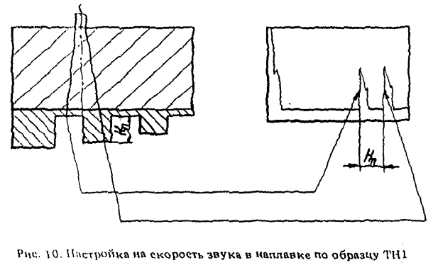 расстояние между эхо-импульсами от впадины и выступа образцов ТН1, ТН3 или ТНН1 (рис. 10, 11) соответствовало глубине паза.