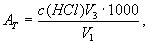 где с (HCl) - точная молярная концентрация раствора соляной кислоты (см. 5.2.6.4), моль/дм3; V1 - объем анализируемой пробы воды, взятый для титрования по 5.3.1, см3; V3 - объем раствора соляной кислоты, израсходованный на титрование до рН 4,5 (см. 5.3.2 или 5.4.2), см3. 5.5.3. Общую щелочность АТ, ммоль/дм3, при определении по способу 2 рассчитывают по формуле