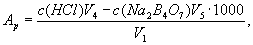 где с (HCl) - точная молярная концентрация раствора соляной кислоты (см. 5.2.6.4), моль/дм3; с (Na2B4O7) - молярная концентрация раствора тетраборнокислого натрия (см. 5.2.8), моль/дм3; V1 - объем анализируемой пробы воды, взятый для титрования по 5.3.1, см3; V4 - общий объем раствора соляной кислоты, использованный при титровании (см. 5.4.2), см3; V5 - объем раствора тетраборнокислого натрия, израсходованный на титрование (см. 5.4.2), см3. 5.5.4. За результат измерений свободной щелочности Ар, ммоль/дм3 (общей щелочности АТ ммоль/дм3), принимают среднеарифметическое значение из результатов параллельных определений (А1 А2) при выполнении условия