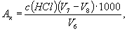 где с (HCl) - точная молярная концентрация соляной кислоты, моль/дм3; V7 - объем раствора соляной кислоты, израсходованный на титрование анализируемой пробы воды по 6.3.1 или 6.3.2, см3; V8 - объем раствора соляной кислоты, израсходованный на титрование холостой пробы по 6.3.3, см3; V6 - объем анализируемой пробы воды, взятый для титрования, см3. 6.4.2. За результат измерений щелочности принимают среднеарифметическое значение из результатов параллельных определений (Ак1; Ак2) при выполнении условия