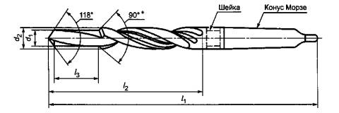 Пример условного обозначения сверла с диаметром малой ступени d1 = Сверло 5 - 1 ГОСТ Р 52966-2008 То же, с диаметром малой ступени d1 = 12,0 мм, типа 2: Сверло 12 - 2 ГОСТ Р 52966-2008 3.3 Направление спирали сверла - правое. Сверла елевым направлением спирали изготовляют по заказам. В примере условного обозначения обозначают буквой «Л». 3.4 Сверла допускается изготовлять как с шейкой, так и без нее. Размеры шейки не регламентируют. 3.5 Центровые отверстия - по ГОСТ 14034-74. 3.6 Размеры конусов Морзе - по ГОСТ 25557-2006. Ключевые слова: сверла спиральные ступенчатые, резьба метрическая, направление спирали, конус Морзе