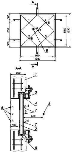 1 - железобетонная стена; 2 - образец для испытаний; 3 - монтажное приспособление (рама); 4 - уплотнение из негорючей минеральной ваты (по периметру); 5 - дистанционные подставки; 6 - места установки печных термопар (6, 7 и 8); 7 - места установки термопар на необогреваемой поверхности стекла (1-5); 8 - неселективный приемник потока теплового излучения