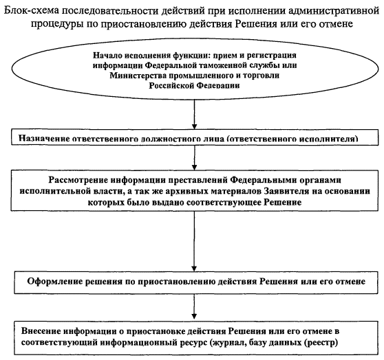 Приложение 15Описание последовательности и состава административных действий по приостановлению действия Решения или его отмене1. Последовательность административных действий Административная процедура по приостановлению действия Решения или его отмене включает административные действия в следующей последовательности: - прием и регистрация письменной информации Федеральной таможенной службы или Министерства промышленности и торговли Российской Федерации; - назначение ответственного должностного лица; - рассмотрение информации, представленной федеральными органами исполнительной власти, о выявленном (-ых) нарушении(-ях) со стороны юридических лиц и индивидуальных предпринимателей, осуществляющих ввоз (вывоз) в Российскую Федерации (из Российской Федерации) озоноразрушающих веществ и содержащей их продукции, ведущих к несоблюдению обязательств Российской Федерации по Монреальскому протоколу, а также материалов Заявителя, на основании которых было выдано соответствующее Решение; - оформление решения по приостановлению действия Решения или его отмене и информирование Министерства промышленности и торговли Российской Федерации, Федеральную таможенную службу о приостановлении действия Решения или его отмене, владельца Решения о приостановлении действия Решения или его отмене; - внесение информации о приостановлении действия Решения или его отмене в соответствующий информационный ресурс (журнал, банк данных (реестр). 2. Состав административных действий