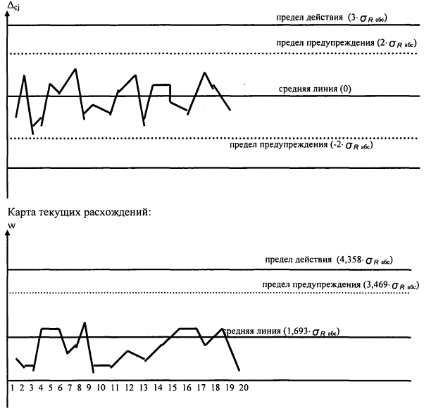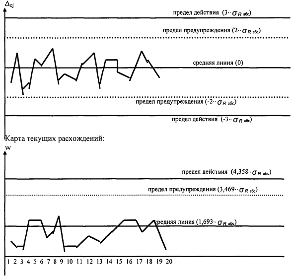Карта текущих расхождений: Средняя линия Пределы действия: верхняя граница, нижняя граница, Пределы предупреждения: верхняя граница, нижняя граница,