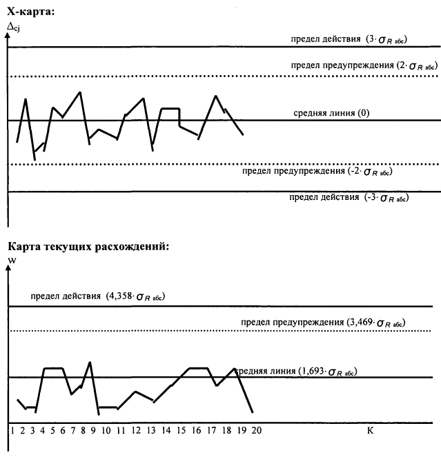 14.3.5 Рассчитанные по формулам (16) и (17) значения наносят на контрольные карты Шухарта - карту оценки систематической погрешности (Х-карта) и карту текущих расхождений. 14.3.6 Параметры контрольных карт Х-карта: