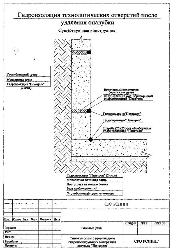 краев конструкции должно быть не менее Допускается укладка гидропрокладки «Пенебар» на влажную бетонную поверхность. При этом перед началом производства работ необходимо удалить стоячую воду с бетонной поверхности. При ремонте гидроизоляции мест вводов коммуникаций необходимо использовать гидропрокладку «Пенебар» совместно с материалами «Пенетрон» и «Пенекрит» (Приложение 4). 12.3. ГИДРОИЗОЛЯЦИЯ ТЕХНОЛОГИЧЕСКИХ ОТВЕРСТИЙ ПОСЛЕ УДАЛЕНИЯ ОПАЛУБКИПри устройстве гидроизоляции в местах технологических отверстий от стяжек крепления щитовой опалубки используются растворы материалов «Пенекрит» и «Пенетрон». Демонтировать пластиковую втулку с помощью дрели или другим приемлемым