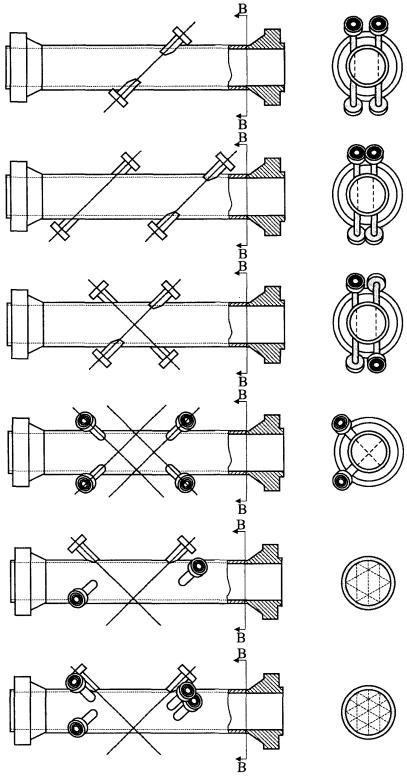 Для уменьшения длины прямого участка ИТ до УЗПР допускается применение струевыпрямителя. Тип струевыпрямителя и место его расположения в ИТ должны указываться изготовителем УЗПР. При отсутствии таких данных поверка УЗПР должна производиться совместно с используемым струевыпрямителем. 9.3 Соединительные фланцы и уплотнительные прокладки ИТ должны быть одинакового диаметра и тщательно подогнаны друг к другу. Сварной шов фланца ИТ, расположенного перед УЗПР, должен быть полностью или частично зачищен. После проведения частичной зачистки сварного шва фланца ИТ необходимо проверить, что диаметр ИТ, измеренный в плоскости сварного шва (Dш), удовлетворяет следующему условию: Dш ³ 0,99DУЗПР, (9.1) где DУЗПР - внутренний диаметр УЗПР. Диаметр Dш определяют как среднее арифметическое значение результатов измерений не менее чем в четырех диаметральных направлениях, расположенных под одинаковым углом друг к другу. Относительная погрешность применяемого СИ не должна превышать 0,1 % измеряемой величины. Уплотнительные прокладки не должны выступать внутрь ИТ. Рекомендуется применение прокладок толщиной не более 3 мм. Для центровки прокладки в процессе монтажа используются три затяжных болта, расположенные под углом 120°. После центровки уплотнительной прокладки все болты плотно затягиваются. 9.4 Для прямых участков ИТ могут использоваться сварные трубы только в том случае, если сварной шов не является спиральным. На прямом участке ИТ длиной 10D, расположенном непосредственно перед УЗПР, высота валика шва не должна превышать 0,015D. 9.5 Не допускается наличие осадков и отложений на поверхности ИТ на участке длиной 10D перед УЗПР. Данный участок может быть осмотрен без демонтажа ИТ при помощи световодов через одно или несколько отверстий в стенках ИТ. При обнаружении на внутренней поверхности ИТ каких-либо отложений их необходимо удалить. 10 Средства измерений и требования к их монтажу10.1. Средства измерений и вспомогательные технические средстваДля проведения измерений расхода и количества природного газа в общем случае применяют следующие СИ и технические устройства: - УЗПР; - СИ параметров потока газа (температура, давление, плотность, компонентный состав); - устройства обработки выходных данных измерительных каналов и вычисления расхода и количества газа; - соединительные линии и вспомогательные устройства (фильтры, струевыпрямители и т.п.). 10.2. Требования к УЗПР и его монтажу10.2.1. УЗПР должен иметь нормированный стандартный выходной сигнал, пропорциональный расходу газа в рабочих условиях. Показания УЗПР должны соответствовать, в пределах погрешности, действительному расходу газа по ИТ во всем диапазоне измерения. При этом параметры (состав, давление, температура, плотность, вязкость и скорость) измеряемого потока газа должны соответствовать требованиям, установленным в эксплуатационной документации на УЗПР. Пределы допускаемой относительной погрешности УЗПР не должны превышать значений: для УЗПР повышенной точности ± 0,5% при qt £ qо £ qов; ± 1,0% при qон £ qо < qt, для УЗПР малой точности: ± 1,0% при qt £ qо £ qов; ± 1,5% при qон £ qо < qов. 10.2.2 Рекомендуется внутренний диаметр УЗПР и ИТ выбирать из условия, что 100 мм £ D £ 900 мм, а максимальная средняя скорость газа не превышает 25 м/с для газораспределительных станций и 20 м/с - для магистральных газопроводов. Н