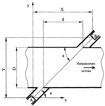 Рисунок 4.1. Схема однолучевого ультразвукового преобразователя расхода: А - с прямым лучом; Б - с отраженным лучом 4.2 Индексы в условных обозначениях величин означают следующее: в - верхний предел измерений; н - нижний предел измерений; кр - критическое значение; max - максимальное значение величины; min - минимальное значение величины; с - стандартные условия (Тс = 293,15 К, Pс = 0,101325 МПа = 1,03323 кгс/см2 по ГОСТ 2939); знак "-" (черточка над обозначением величины) - среднее значение величины; 1 - движения против направления потока газа; 2 - движения по направлению потока газа. 4.3 Сокращения, примененные в настоящем стандарте: ИТ - измерительный трубопровод; ПЭА - преобразователь электроакустический; СИ - средство измерений; УЗПР - ультразвуковой преобразователь расхода. 5 Требования к погрешности измеренийПределы относительной погрешности измерений объемного расхода и объема природного газа, приведенного к стандартным условиям, по данной методике не должны превышать: при применении УЗПР повышенной точности: ± 1 % при qt £ qо £ qов, ± 1,5% при qон £ qо £ qt; при применении УЗПР малой точности: ± 1,5% при qt £ qо £ qов, ± 2,0 % при qон £ qо < qов, где qон и qов - нижний и верхний пределы измерений применяемого УЗПР. Статистические оценки погрешности измерений могут быть получены на основе расчетов, выполненных в соответствии с разделом 14. 6 Метод измерений6.1 Принцип измеренийПринцип измерений с помощью УЗПР основан на том, что ультразвуковой импульс, направленный вдоль потока, распространяется быстрее ультразвукового импульса, направленного против потока. Разность времен прохождения ультразвукового импульса, а также время прохождения импульсов по направлению потока газа и против него зависят от средней скорости газа вдоль акустического пути. Формула для расчета средней скорости потока вдоль акустического пути имеет вид: