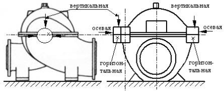 Рисунок 14.1 - Точки измерения на опоре подшипника На вертикально установленных насосах вибрация измеряется в точках, показанных на рисунке 14.2. У насосов, не имеющих выносных подшипниковых узлов (насосов со встроенными подшипниками типа НГПНА, ЦНС), вибрация измеряется на корпусе, над подшипником в точке, расположенной как можно ближе к оси вращения ротора (рисунок 14.3). 14.1.9 Для оценки жесткости крепления рамы к фундаменту вибрация измеряется на всех элементах крепления насоса к фундаменту. Измерение производится в вертикальном направлении на анкерных болтах (головках) или рядом с ними на фундаменте на расстоянии не более 100 мм от них. Измерение проводится при плановом и неплановом вибродиагностическом контроле. 14.1.10 Для проведения вибродиагностических контролей используется аппаратура, как для измерения среднего квадратического значения вибрации так и универсальная виброанализирующая аппаратура с возможностью измерения спектральных составляющих вибрации и амплитудно-фазовых характеристик. Аппаратура должна соответствовать ГОСТ ИСО 2954.