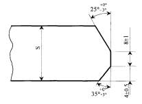 7.1.4 Отклонение профиля наружной поверхности трубы от окружности в зоне сварного соединения на концевых участках длиной 200 мм от торцов и по дуге периметра 200 мм не должно превышать 0,15% номинального диаметра. 7.1.5 Отклонение от перпендикулярности торца трубы относительно образующей (косина реза) не должно превышать 1,6 мм. 7.1.6 Кривизна труб не должна превышать 1,5 мм на 1 м длины, а общая кривизна - 0,2% длины трубы. 7.1.7 Предельные отклонения от номинального наружного диаметра на концах труб на длине не менее 200 мм от торца должны быть: не более ±1,5 мм для труб диаметром менее 1020 мм и ±1,6 мм для труб диаметром 1020 и 1220 мм. 7.1.7 Допуск на овальность труб (отношение разности между наибольшим и наименьшим диаметрами к номинальному диаметру) не должен превышать 1% по концам труб с толщиной стенки менее 20 мм и 0,8% по концам труб с толщиной стенки 20 мм и более. 7.1.8 Не допускаются отклонения от прямолинейности концов труб более чем на 0,5 мм на длине до 500 мм, измеренные по зазору между металлической линейкой, поставленной на ребро, и внутренней или наружной поверхностью трубы. 7.1.9 Форма и размеры разделки кромок торцов труб под сварку в зависимости от толщины стенки должны соответствовать параметрам, установленным на рисунке 7.1.1. В зоне заводского сварного шва допускается ширина притупления не более 3 мм.