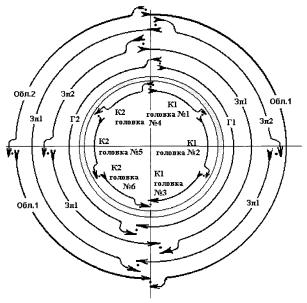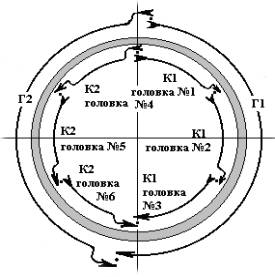 Рис. 5.4.3. Схема двухсторонней автоматической сварки в среде защитных газов кольцевого стыка труб при выполнении корневого слоя шва и "горячего прохода": К - корневой слой, Г - "горячий проход", (цифра после обозначения слоя указывает на очередность сварки данного участка в пределах слоя); ® - указывает направление сварки.Сварку корневого шва выполняют изнутри трубы многоголовочным автоматом: одновременно всеми головками, работающими на правом полупериметре трубы, затем аналогичным количеством сварочных головок на левом полупериметре трубы. Количество головок внутритрубного автомата от 4 до 8 шт. в зависимости от диаметра трубы. Таблица 5.4.1 - Режимы двухсторонней автоматической сварки в среде защитных газов при сварке корневого слоя и "горячего прохода"