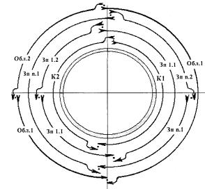 Рис. 5.4.4 Схема двухсторонней автоматической сварки в среде защитных газов кольцевого стыка труб: К - корневой слой, Г - "горячий проход", Зп - заполняющий слой, Обл. - облицовочный слой (цифра после обозначения слоя указывает на очередность сварки данного участка в пределах слоя); ® - указывает направление сварки. Таблица 5.4.3 - Параметры режимов сварки заполняющих и облицовочного слоев с применением однодуговой наружной головки П-200 или П-260