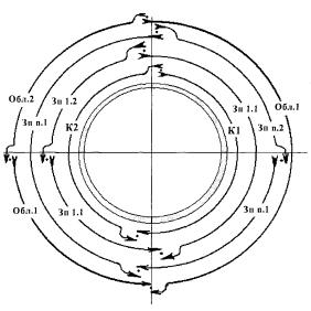Рис. 5.5.2 Схема и последовательность автоматической сварки кольцевого стыка Обозначения: К1, К2 - участки первого прохода (корневого слоя и горячего прохода) на левом и правом полупериметрах трубы. Зп 1.1 - заполняющие слои. Первая цифра обозначает номер прохода, вторая - последовательность сварки в пределах прохода. За один проход производится сварка двух заполняющих слоев. Обл.1 - облицовочный слой. Цифра обозначает последовательность сварки в пределах прохода. 5.5.4.10 Для обеспечения равномерного заполнения разделки кромок перед сваркой облицовочного слоя в случае необходимости выполняется корректирующий слой шва. Сварка производится в пространственном положении 2.00-4.00 час и 8.00-10.00 час однодуговым процессом, т.е. с отключением на каждой сварочной головке по одной горелке. 5.5.4.11 Сварка облицовочного слоя выполняется за один проход двумя параллельными валиками. Валики облицовочного слоя должны перекрывать друг друга, обеспечивая плавное сопряжение между собой и с основным металлом трубы. Амплитуду колебаний при сварке облицовочного шва назначают из расчета перекрытия швом разделки по ширине на 1,0¸2,5 мм в каждую сторону. 5.5.4.11 Схема сварного шва приведена на рис. 5.5.3.