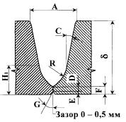 Рис. 5.9.1. Форма специальной узкой разделки кромок 5.9.14.2 Режимы сварки при использовании специальной узкой разделки кромок приведены в таблице 5.9.4. Таблица 5.9.4 - Параметры режимов при сварке проволокой Иннершилд в специальную узкую разделку кромок