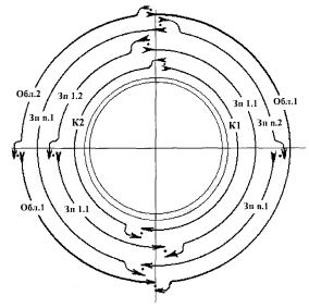 Рис. 5.4.5 Схема и последовательность односторонней автоматической сварки кольцевого стыка головками П-200 и П-260: Обозначения: К1, К2 - участки первого прохода (корневого слоя и горячего прохода) на левом и правом полупериметрах трубы. Зп 1.1 - заполняющие слои. Первая цифра обозначает номер прохода, вторая - последовательность сварки в пределах прохода. За один проход производится сварка двух заполняющих слоев. Обл.1 - облицовочный слой. Цифра обозначает последовательность сварки в пределах прохода. Таблица 5.4.5 - Параметры режимов односторонней автоматической сварки с применением однодуговых наружных головок П-200 или П-260