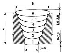 5.10.1.9 Облицовочный слой шва выполняется: - при толщинах стенки трубы до 16 мм - за один проход; - при толщинах стенки трубы 16-20 мм - за один-два прохода; - при толщине стенки трубы более 20 мм - за два-три прохода. При выполнении сварки стыков на уклонах при наклоне трубы более 250° валиковая сварка используется при сварке толщин стенок свыше 10-12 мм. 5.10.1.10 Минимальное число слоев шва при сварке электродами с основным видом покрытия "на подъем" приведено в табл. 5.10.1.2. Число слоев указано без учета подварочного слоя. Таблица 5.10.1.2 - Минимальное число слоев шва при сварке электродами с основным видом покрытия "на подъем"