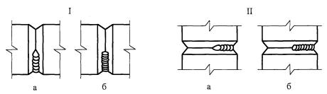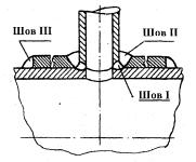 Рис. 12.3. Порядок выполнения сварных швов прямых врезок: а - с усиливающей накладкой (воротником); б - без установки воротника.