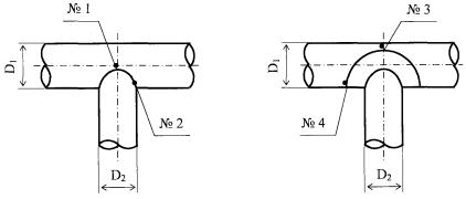 Рис. 12.4. Схема отбора образцов для испытания металла шва на излом: № 1 и № 2 - образцы из углового сварного соединения; № 3 и № 4 - образцы из нахлесточного сварного соединения 12.5.6 С учетом требований п. 12.5.5 в процессе аттестации технологии сварки прямых врезок с установкой воротника следует выполнить не менее двух сварных соединений: - первое соединение - врезка без установки воротника (шов I на рис. 12.3-а); - второе соединение - врезка с установкой воротника (швы I-III на рис. 12.3-б). Из первого соединения вырезают два образца для испытаний на излом углового соединения, из второго соединения - 2 образца для испытаний нахлесточного соединения (см. Приложение А). Оба стыка предварительно должны быть проконтролированы согласно п. 12.5.4. При аттестации технологии сварки прямых врезок с диаметром трубы-ответвления менее 57 мм рекомендуется дополнительно выполнить еще одну врезку без установки воротника (шов I). В данном случае из каждого углового соединения следует вырезать по одному образцу шириной 40 мм (ориентировочно) для испытаний на излом. 12.5.7 Тип и количество образцов для механических испытаний контрольных сварных соединений при аттестации технологии исправления дефектов (ремонта) сварных швов представлены в таблице 12.13. Таблица 12.13 - Виды механических испытаний при аттестации технологии ремонта кольцевых стыков и количество образцов для испытаний сварных соединений диаметром 426 мм и более