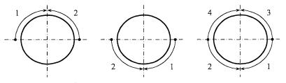 Рис. 5.6.4.1 Схема и размеры разделки кромок Условные обозначения и величины геометрических параметров: С = 10-2; D = 1,0 ± 0,2 мм; E = 1,0 ± 0,2 мм; F = 2,0 ± 0,2 мм; G = 25 ± 1°; R = 6,0+2 мм; H1 = 7,0 мм. Неуказанные предельные отклонения размеров ± 0,3 мм. 5.6.4.3 Установка на трубах направляющих поясов для сварочных автоматов. Установку поясов производят с помощью шаблонов, задающих одинаковое расстояние поясов от торца трубы. Пояс устанавливается на торец трубы, обращенный в сторону движения сварочно-монтажной колонны. 5.6.4.4 Предварительный подогрев осуществляется в соответствии с разделом 5.1 настоящего РД. 5.6.4.5 Сборка стыка 5.6.4.5.1 Сборку стыка следует производить на специальном внутреннем пневматическом центраторе, входящем в состав комплекса оборудования. Центратор устанавливают таким образом, чтобы медная технологическая подкладка находилась в плоскости стыка. 5.6.4.5.2 Перед началом работ следует произвести с помощью газовой горелки просушку медного подкладного кольца путем нагрева его секторов до температуры 20-50 °С. 5.6.4.5.3 Стык следует собирать без зазора. Допускаются локальные зазоры не более 1,0 мм. В случае, если при сборке не удается закрыть зазор в стыке, то рекомендуется собрать стык таким образом, чтобы локальные зазоры, величиной не более 1,0 мм, располагались в верхней части стыка. 5.6.4.5.4 Величина распределенного смещения кромок в собранном стыке - не более 2 мм. Если распределенное смещение кромок выше 2 мм и качество сборки не может быть улучшено поворотом стыкуемой трубы вокруг горизонтальной оси, то следует заменить трубу, подаваемую на сборку. Допускаются локальные смещения кромок не более 3 мм при их суммарной длине £1/12 периметра трубы. При этом максимальная величина смещения не должна превышать значений, регламентированных п. 5.1.16. 5.6.4.5.5 После сборки стыка следует простучать его по всему периметру кувалдой с ударной частью из цветного металла для более плотного прилегания секторов медного подкладного кольца к внутренней поверхности трубы. Зазоры между элементами медного подкладного кольца и внутренней поверхностью трубы не должны превышать 0,5 мм. 5.6.4.6 Сварка стыка 5.6.4.6.1 Сварку всех слоев шва производят "на спуск". На стыке при сварке каждого слоя работают два автомата. Каждый автомат производит сварку одного из полупериметров трубы относительно вертикальной оси. Типовая схема сварки и последовательность сварки отдельных участков приведена на рис. 5.6.4.2. 5.6.4.6.2 Параметры режима сварки каждого слоя предварительно запрограммированы и записаны на картриджах специальной конструкции, установленных в блоки управления каждого агрегата питания. Перед началом сварки конкретного слоя сварщик-оператор с помощью переключателя, установленного на сварочной головке, задает порядковый номер свариваемого слоя. 5.6.4.6.3 В процессе сварки стыка сварщик имеет возможность с пульта дистанционного управления корректировать положение электродной проволоки поперек стыка, вылет, и в узких пределах амплитуду колебаний электродной проволоки и напряжение на дуге. Дискретность регулирования положения электродной проволоки поперек стыка, вылета и амплитуды колебаний - 0,5 мм, напряжения на дуге - 0,2 В. 5.6.4.6.4 Сварку корневого слоя выполняют снаружи трубы. Формирование корневого шва происходит на медной технологической подкладке, установленной на центраторе. 5.6.4.6.5 Сва