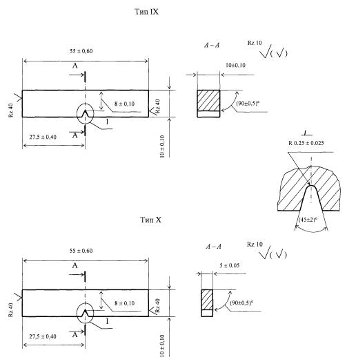 3.1 При испытании на ударный изгиб определяют энергию удара и ударную вязкость металла шва на образцах с острым надрезом (Шарпи) типа IХ (для толщины основного металла 11 мм и более) и типа Х (для толщины основного металла 6-10 мм) по ГОСТ 6996-66. Форма и размеры образцов представлены на рис. 3.1. Схема нанесения надреза на образцах приведена на рис. 3.2.