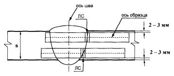 5.2 Образцы для испытания нахлесточного соединения должны иметь ширину 25 мм (приблизительно) и длину 100-150 мм (см. рис. 5.2). Надрез выполняется ножовкой со стороны, противоположной усилению сварного шва. Глубина надреза равна толщине стенки трубы плюс половина высоты поперечного сечения сварного шва. Допускается применение шлифмашинки (с узким шлифкругом) для выполнения части наклонного надреза (пропила) на глубину, равную толщине стенки трубы. Заключительную часть надреза следует выполнять ножовкой.