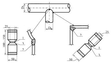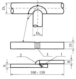 1 - надрез глубиной S + половина высоты поперечного сечения сварного шва (S - толщина стенки трубы); 2 - сварной шов; 3 - обработка сварного шва газовой резкой.