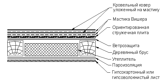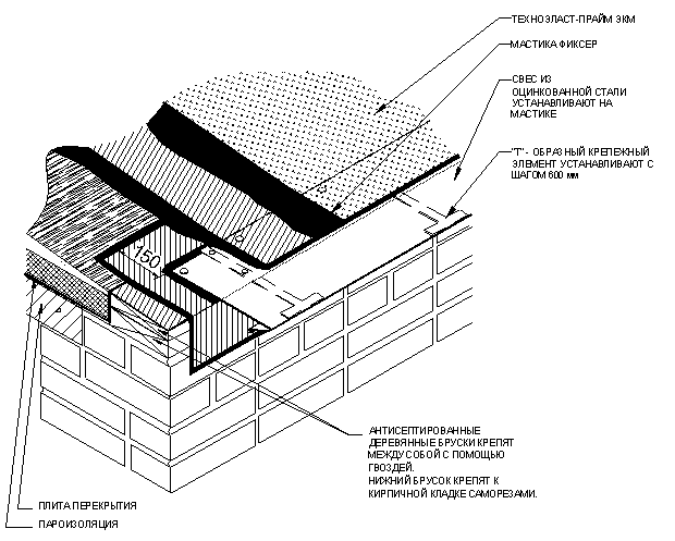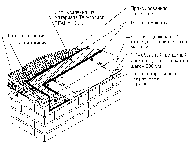 Устройство свеса неорганизованного водостока начинают с укладки слоя усиления на свес кровли. Материал слоя усиления должен заходить на фасадную часть на 100 мм и выступать из-под отлива из оцинкованной стали на 150 мм. Слой усиления укладывают на мастику Вишера. После фиксации «Т»-образных крепежных элементов к деревянным брускам, на место установки оцинкованного свеса наносят мастику и крепят свес. Наклейку слоев основного водоизоляционного ковра на карнизе осуществляют так же, как и на основной плоскости. Устройство деформационного шва.