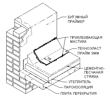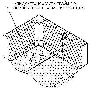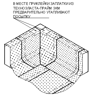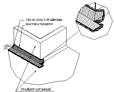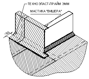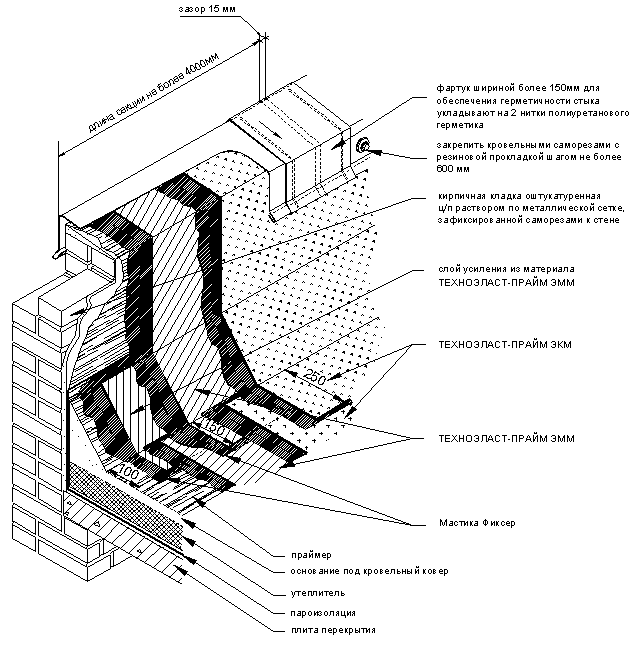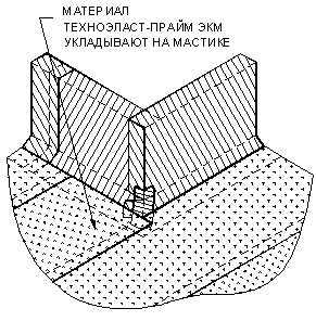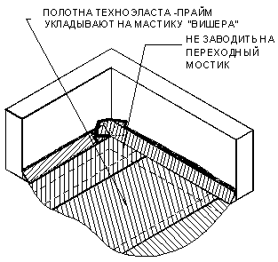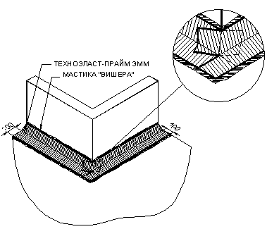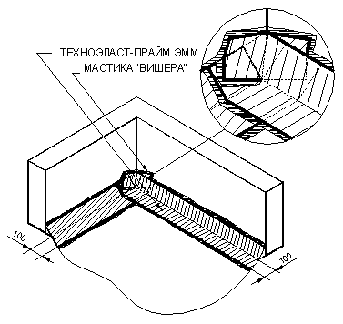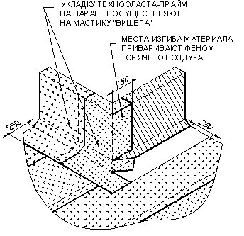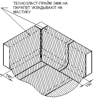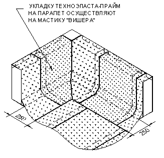 УКЛАДКА ДОПОЛНИТЕЛЬНЫХ СЛОЕВ КРОВЕЛЬНОГО КОВРА. Выполнение кровельного ковра начинают с оклейки дополнительным слоем усиления мест сопряжения кровельного ковра с кровельными конструкциями и элементами кровли. К таким узлам относятся места примыканий кровельного ковра к парапетным стенам, вентиляционным или лифтовым шахтам, места установки водосточных воронок, места проводки труб через кровлю. Дополнительные слои укладывают также в местах свесов. В качестве материала для дополнительного слоя используют материал «Техноэласт-Прайм ЭММ». Для наклейки материала применяется приклеивающая битумно-полимерная мастика ”Вишера”. Укладка материала в местах примыкания кровельного ковра к вертикальным поверхностям (сопряжения кровельного ковра с парапетными стенами, стенами соседних зданий, лифтовыми шахтами, вентиляционными трубами прямоугольного сечения и т.д.):