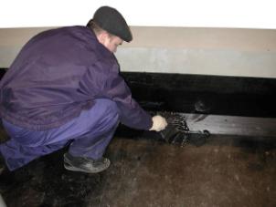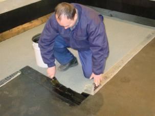 Для оснований из сборных стяжек в местах примыканий к стенам, парапетам, вентиляционным шахтам и другим кровельным конструкциям выполняют наклонные бортики под углом 45º из жесткого минераловатного утеплителя, сечением 100х100. Требования к деревянным основаниям (Из влагостойкой фанеры и плит ОСБ). Листы влагостойкой фанеры должны крепиться к стропильным ногам с помощью ершеных гроздей или саморезами. Торцевые стыки фанерных листов должны закрепляться на стропильной ноге. Перепады между отдельными листами фанеры не должны превышать по высоте 3 мм. Для увеличения срока службы деревянной конструкции рекомендуем обработать деревянные поверхности антисептиком. 5. Укладка материала.Укладка материалов на холодные битумно-полимерные мастики может производится при температуре воздуха выше +5ºС. При температурах воздуха ниже +5ºС работы производят в тепляках. Укладка на влажное или увлажненное основание не допускается. Перед устройством гидроизоляции изолируемая поверхность должна быть сухой. Влажность бетона или цементно-песчаной стяжки в поверхностном слое на глубине 20 мм должна быть не более 4%. Подготовка поверхности бетонного основания, цементно-песчаной и сборной стяжки под укладку материала.