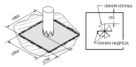 Формирование узла начинают сразу после подготовки основания под укладку материала. На праймированную поверхность в месте установки воронки укладывают заготовку материала Техноэласт-Прайм ЭММ. Укладку производят на мастику ”Вишера”. Размер укладываемой заготовки должен быть не менее 500×500 мм, при этом расстояние от края воронки до края куска усиления должно быть не менее 150 мм. После укладки каждого слоя материала на этом узле, его прикатывают силиконовым роликом. В случае если материал отходит от основания после высыхании мастики, эти места приклеивают феном горячего воздуха. Примыкание кровельного ковра к трубе.
