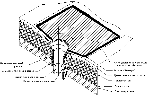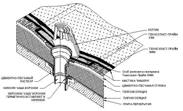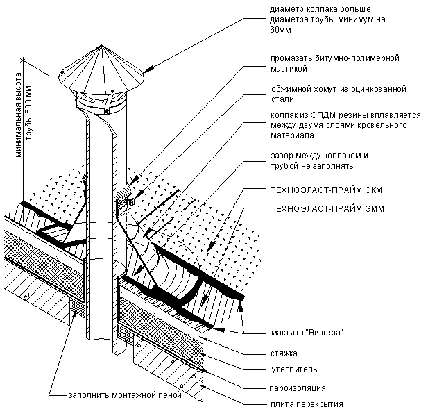 Фасонный резиновый элемент в месте пропуска трубы через кровлю устанавливается непосредственно на материал нижнего слоя кровельного покрытия на мастику «Вишера». Допускается приклейка фасонных элементов горячей битумно-полимерной мастикой ”Эврика”. Это позволяет сократить срок выполнения узла (не требуется ждать пока мастика, на которую приклеивается фасонный элемент высохнет). Для герметизации стыка трубы и верха фасонного элемента применяют полиуретановые или тиаколовые (полисульфидные) герметики. Устройство свеса неорганизованного водоотвода.