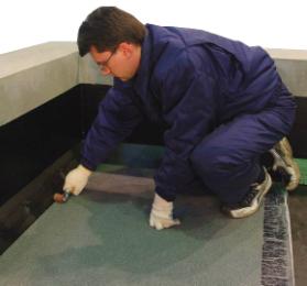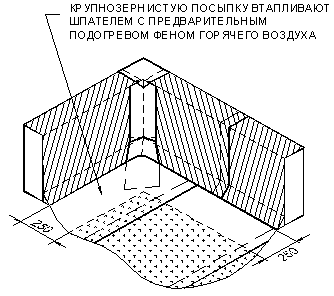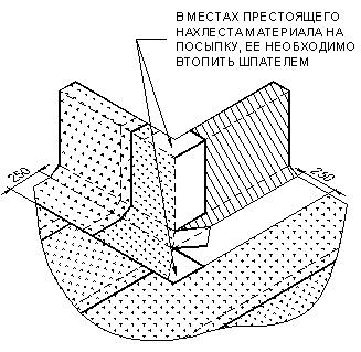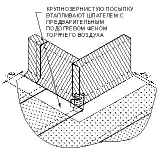 Прикатать место склейки материала силиконовым роликом. Выдавившуюся мастику из-под бокового и торцевого шва присыпают сверху посыпкой. Нанесенную посыпку необходимо вдавить в битумно-полимерную мастику.