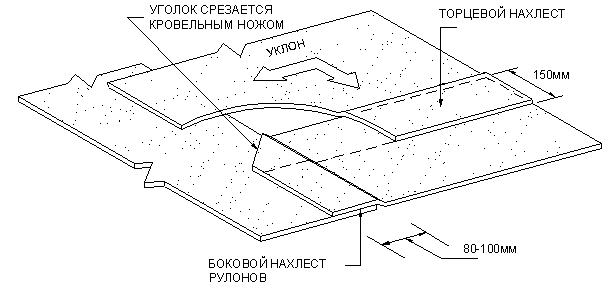 После удаления посыпки и подрезки уголка на место формирования торцевого нахлеста наносят слой битумно-полимерной мастики.