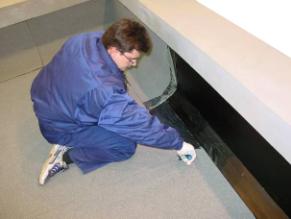 Укладка первого слоя материала Техноэласт-ПраЙм на горизонтальной поверхности.