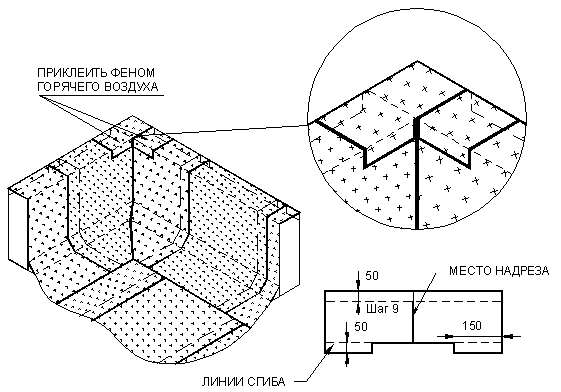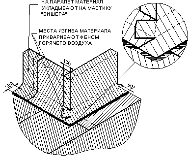 6. Раскрой материала и выполнение узлов кровли.Вариант раскроя и укладки материала во внешнем углу кровли.