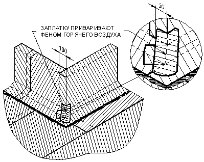 Формирование узла деформационного шва производят в последовательности, описанной в п. 6.3. «Примыкание к парапету». 7. РЕМОНТ КРОВЕЛЬНОГО КОВРА.Небольшие повреждения кровельного ковра, такие как проколы, порезы заделываются установкой заплатки на поверхность кровельного ковра. Заплата должна иметь закругленные края и перекрывать поврежденную поверхность не менее чем на 100 мм во всех направлениях.