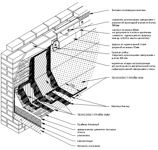 В случаях, если кровельный ковер примыкает к вертикальной стене здания, его заводят на вертикальную поверхность не мене чем на 300 мм и фиксируют к основанию. Фиксация кровельного ковра на вертикальной стене может производится с помощью краевой рейки. Особенности укладки материала полностью аналогичны описанным в предыдущем пункте. Рейку крепят кровельными саморезами с помощью электрошуруповерта. Верхний отгиб краевой рейки заполняют герметизирующей мастикой «Вишера». Устройство узла внутреннего водостока.