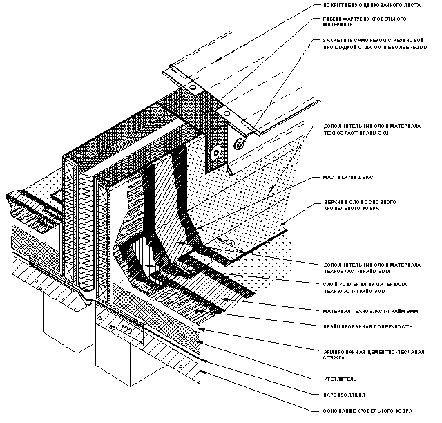 В местах установки пристенных желобов или свесов до установки отливов из оцинкованной стали также укладывают слой усиления. Материал слоя усиления должен заходить на фасадную часть на 100 мм и выступать из-под отлива из оцинкованной стали на 150 мм.