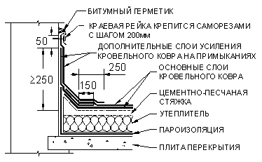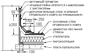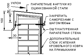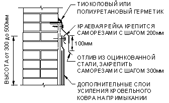 Рис. 26 Примыкание кровельного ковра к парапетной стене высотой менее 500 мм. При креплении парапетного фартука расстояние между точками крепления определяется жесткостью профиля, но не должно превышать 600 мм. Не рекомендуется жестко скреплять все листы стальных фартуков между собой. Листы можно скреплять в секции длинной не более 4 м.