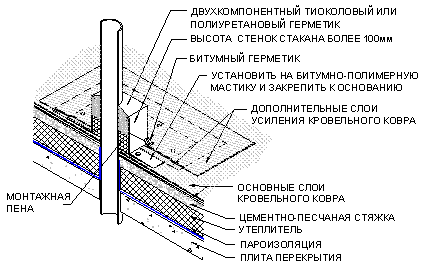 3.5.3. Высота заведения на вертикальную поверхность дополнительных слоев усиления кровельного ковра на примыканиях должна составлять не менее 300 мм. 3.5.4. На вертикальных поверхностях дополнительные слои усиления механически фиксируют к основанию с помощью краевой рейки или шайбами Æ 50 мм. Крепление осуществляют с помощью дюбелей или саморезами по бетону с шагом 200 мм. 3.5.5. В случаях заведения дополнительных слоев усиления на парапетную стену, край верхнего слоя усиления должен заводится на фасадную часть парапетной стены. 3.6. Примыкание кровельного ковра к трубам.3.6.1. Примыкания к круглым трубам. Стальные трубы диаметром не менее 100 мм могут обклеиваться наплавляемым материалом, а герметизация труб малого диаметра может осуществляться с помощью стального стакана и двухкомпонентного герметика. 3.6.2. Стальной стакан с герметиком. Стальной стакан, заполненный двухкомпонентным герметиком, применяется для герметизации: · жестких труб малого диаметра; · пучков труб; · гибких труб; · опор необычной формы (конструктивные балки, каналы и т.д.); · анкеров.