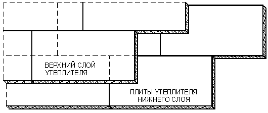 Рис. 7. Смещение плит верхнего и нижнего слоев при укладке. 4.3.4. Укладку утеплителя проще всего начинать с угла кровли. При укладке теплоизоляционные плиты дополнительно режут так чтобы стыки плит 1-го и 2-го слоев не совпали (см. рис. 8). Такая разрезка утеплителя подходит для утеплителей размером 500×1000 мм или 600×1200 мм.