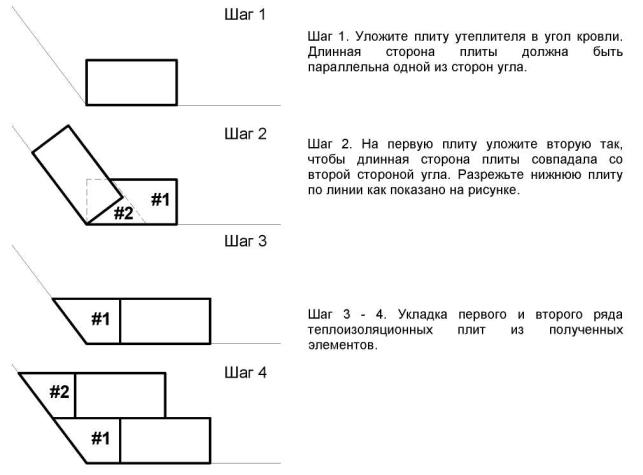 При такой разрезке теплоизоляционных плит швы плит первого и второго слоя не совпадают и количество отходов от распила практически нулевое. Для упрощения укладки плитного утеплителя в непрямых углах рекомендуем применить следующий способ разрезки плит (см. рис. 9).