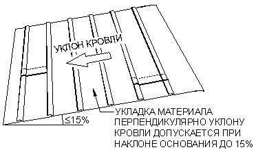 Рис. 11. Укладка материала на скате кровли. 4.6.2. Перекрестная наклейка полотнищ рулонов не допускается. 4.6.3. Укладку рулонного материала начинают с нижележащих участков. 4.6.4. В процессе производства кровельных работ должен быть обеспечен нахлест смежных полотнищ не менее 80 мм (боковой нахлест). Торцевой нахлест рулонов должен составлять 150 мм (см. рис. 12).