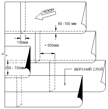 Рис. 12. Нахлесты полотнищ рулонного материала. 4.6.5. Расстояние между боковыми стыками кровельных полотнищ в смежных слоях должно быть не менее 300 мм. Торцевые нахлесты соседних полотнищ кровельного материала должны быть смещены относительно друг друга на 500 мм (см. рис. 13)
